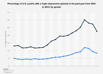 In the United States, data from the National Survey on Drug Use and Health (NSDUH) show that major depressive episodes among women aged 18–25 nearly doubled between 2009 and 2022, rising far faster than among men of the same age. By the early 2020s, young women were roughly twice as likely as young men to report a recent major depressive episode.