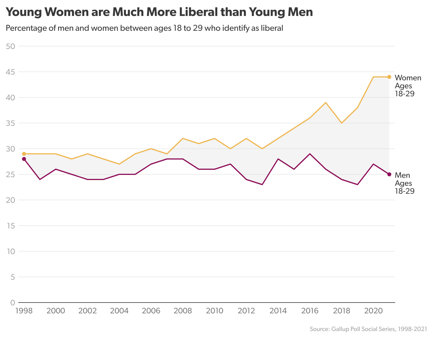 The timing of the shift is critical. Prior to roughly 2010, ideological differences between young women and other groups existed but were modest and unstable. In some periods, young women were slightly more liberal; in others, the gap nearly disappeared.