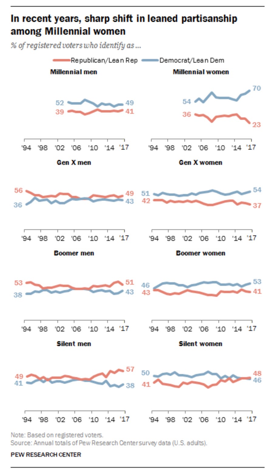 While young men have either remained stable or moved modestly in the opposite direction (which ironically dozens of media sources report as “radicalization of young men.”