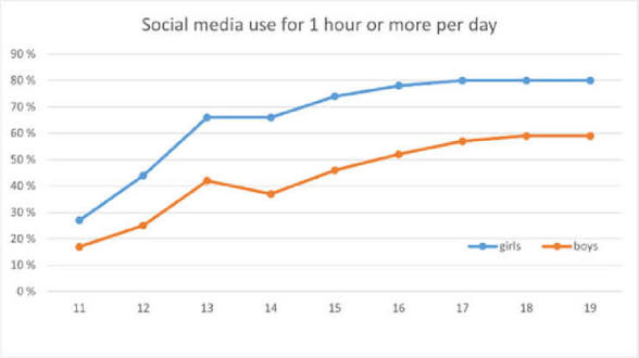 Mental health trends also align closely with changes in media consumption. Young women are, by a wide margin, the heaviest users of social media platforms measured in: