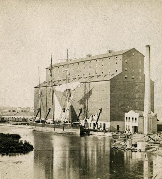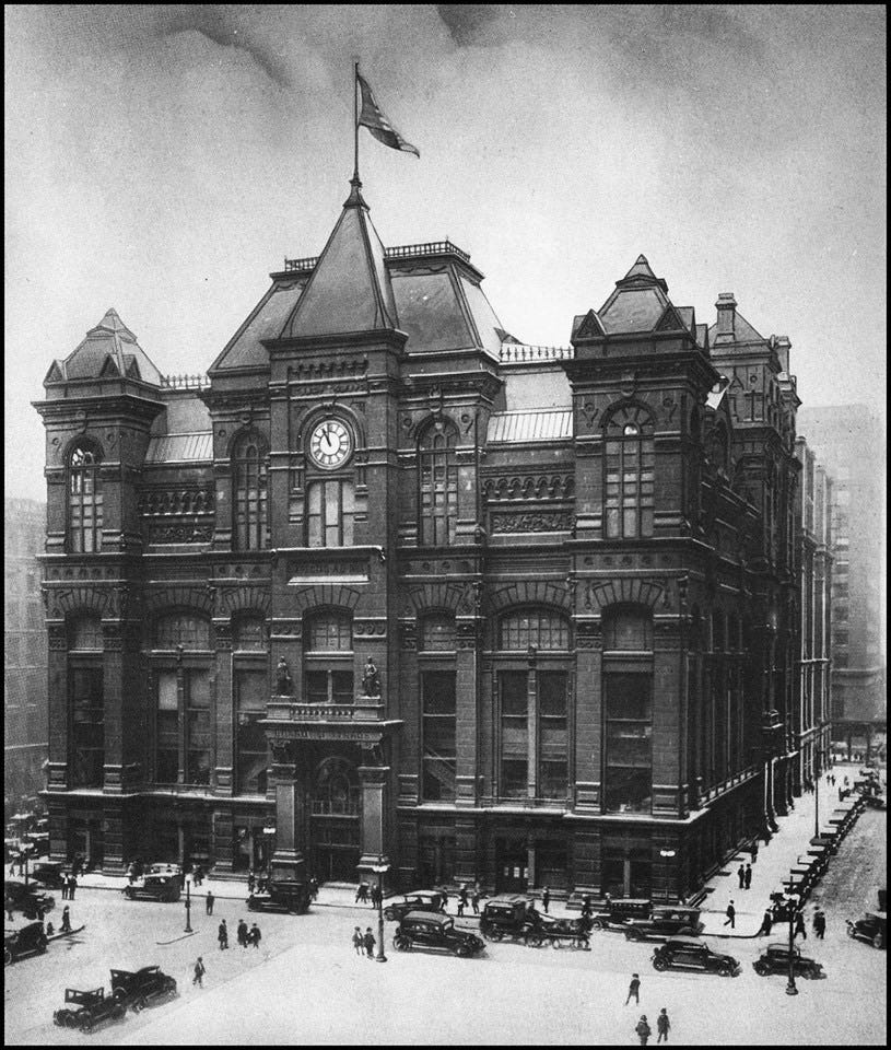 All of this grain had to be kept track of as it moved through the massive logistics chain. Chicago’s Board of Trade (located in the building shown above) created grain grading standards in the 1850s. By 1865, it was trading futures contracts, allowing farmers to lock in prices ahead of harvest. Futures markets reduced risk and gave grain a stable price on world markets.