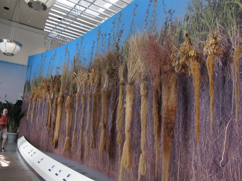 The grass that grows in the Temperate Grassland biome has one huge disadvantage for humans: their dense mat of roots is so thick and deep as to be almost impossible to plow. Most types of plants have the bulk of their material above the surface. Grasses, however, have the bulk of their material in the roots. These roots typically extend many meters below the surface and intermingle with the roots of other grass nearby. This makes grass very difficult to kill. You can remove the visible parts of the plants, but then it just grows back.