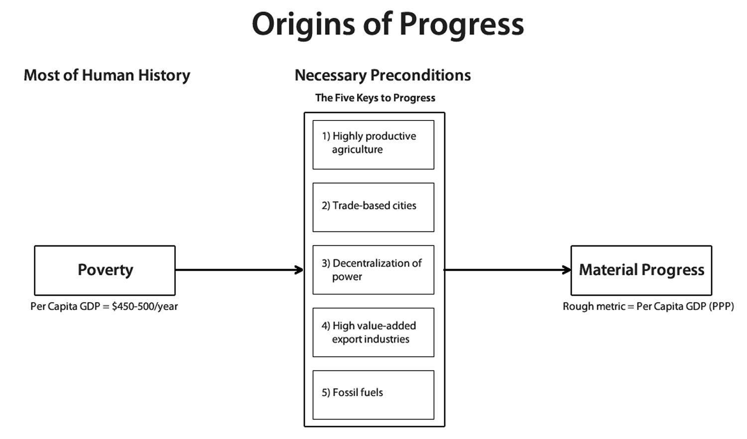 I believe that the degree to which peoples have enjoyed progress in history (and to a certain extent today) is largely determined by long-term historical factors that go back centuries or even millennia. These factors determined the extent to which societies acquired the Five Keys to Progress. For most of human history, there was no progress, because these five keys were either completely missing or were very underdeveloped.